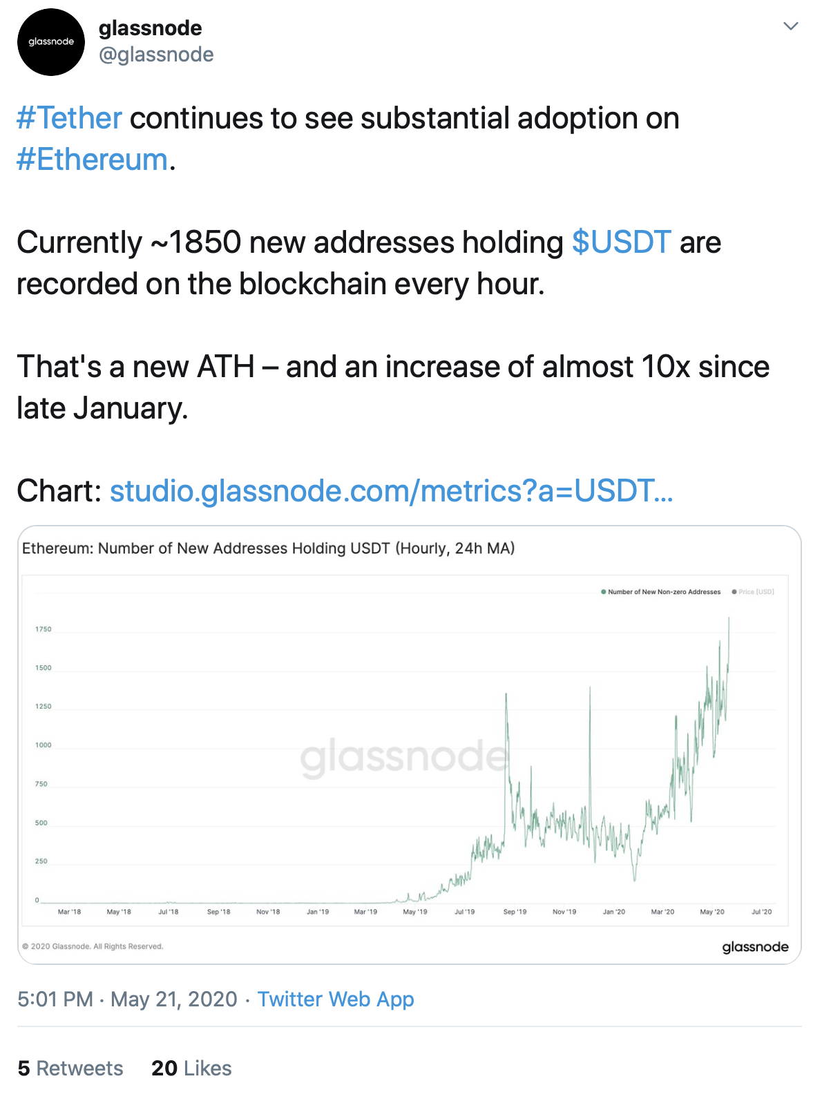 According to data reported by glassnode (@glassnode), 1850 new addresses holding USDT are being recorded every hour. In total, the number of addresses holding USDT is up ten times since late January.