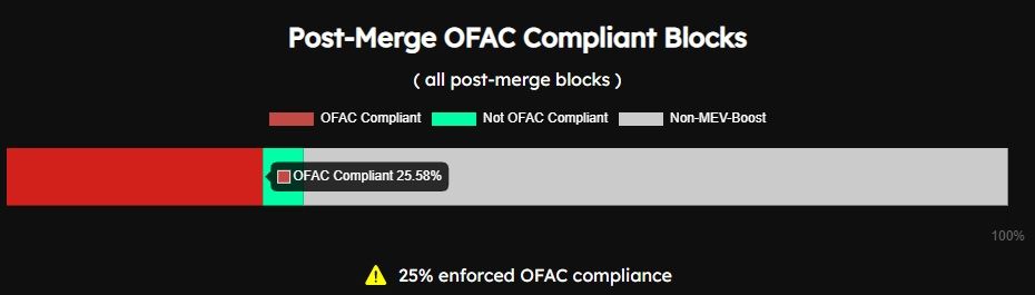 A number of MEV-Boost relays are regulated under OFAC and can censor transactions. Over 25% of Ethereum blocks are now compliant with OFAC regulations.