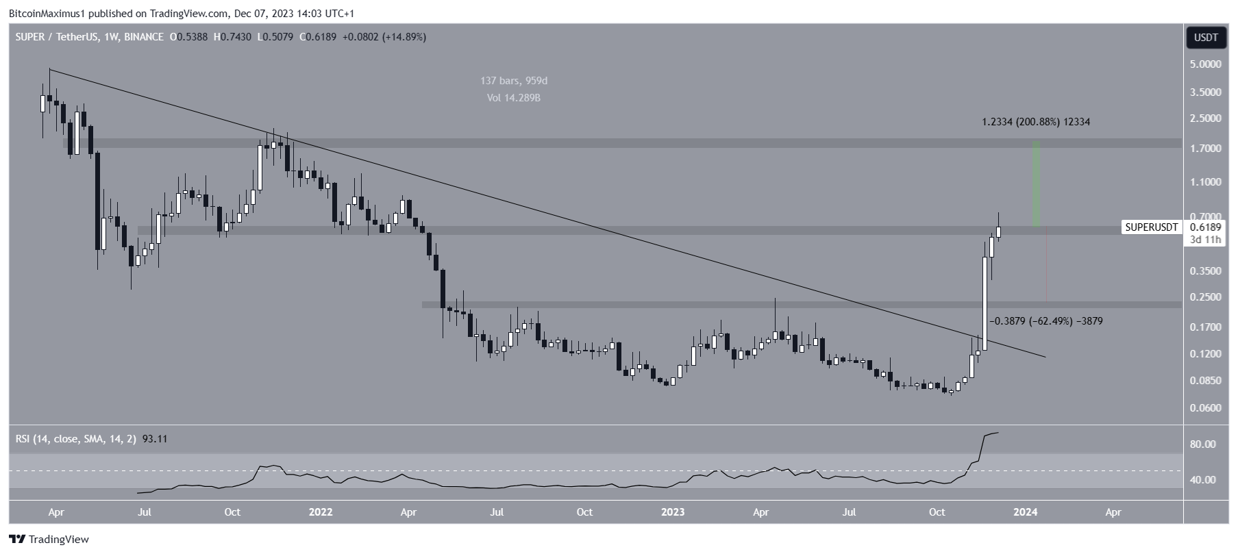 The final altcoin with the potential for considerable increases in December is SuperVerse. The SUPER price had decreased under a long-term descending resistance trend line since March 2021. The decrease led to a low of $0.069 in October.
