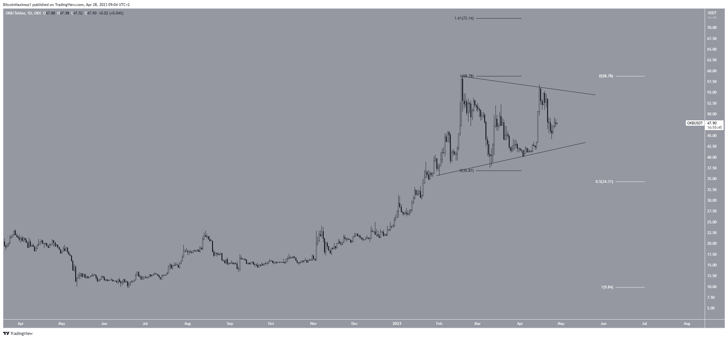 The OKB price has traded inside a symmetrical triangle since Feb. 17. The symmetrical triangle is considered a neutral pattern, meaning that both a breakout and breakdown are possible. Currently, the price trades in the middle of the pattern.