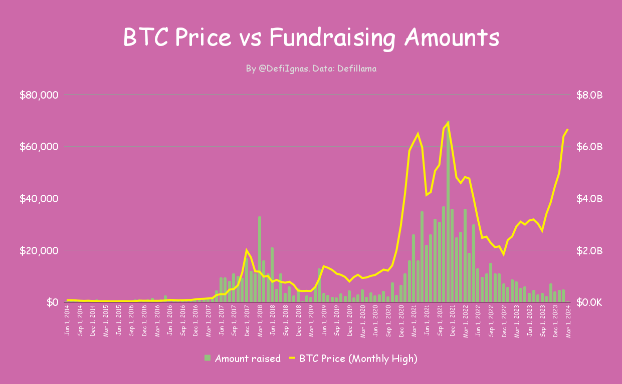 However, the pace of venture capital fundraising in crypto has seen a slowdown, raising questions among market observers. For instance, DeFi Researcher Ignas has noted a lag in fundraising activities despite favorable market conditions.