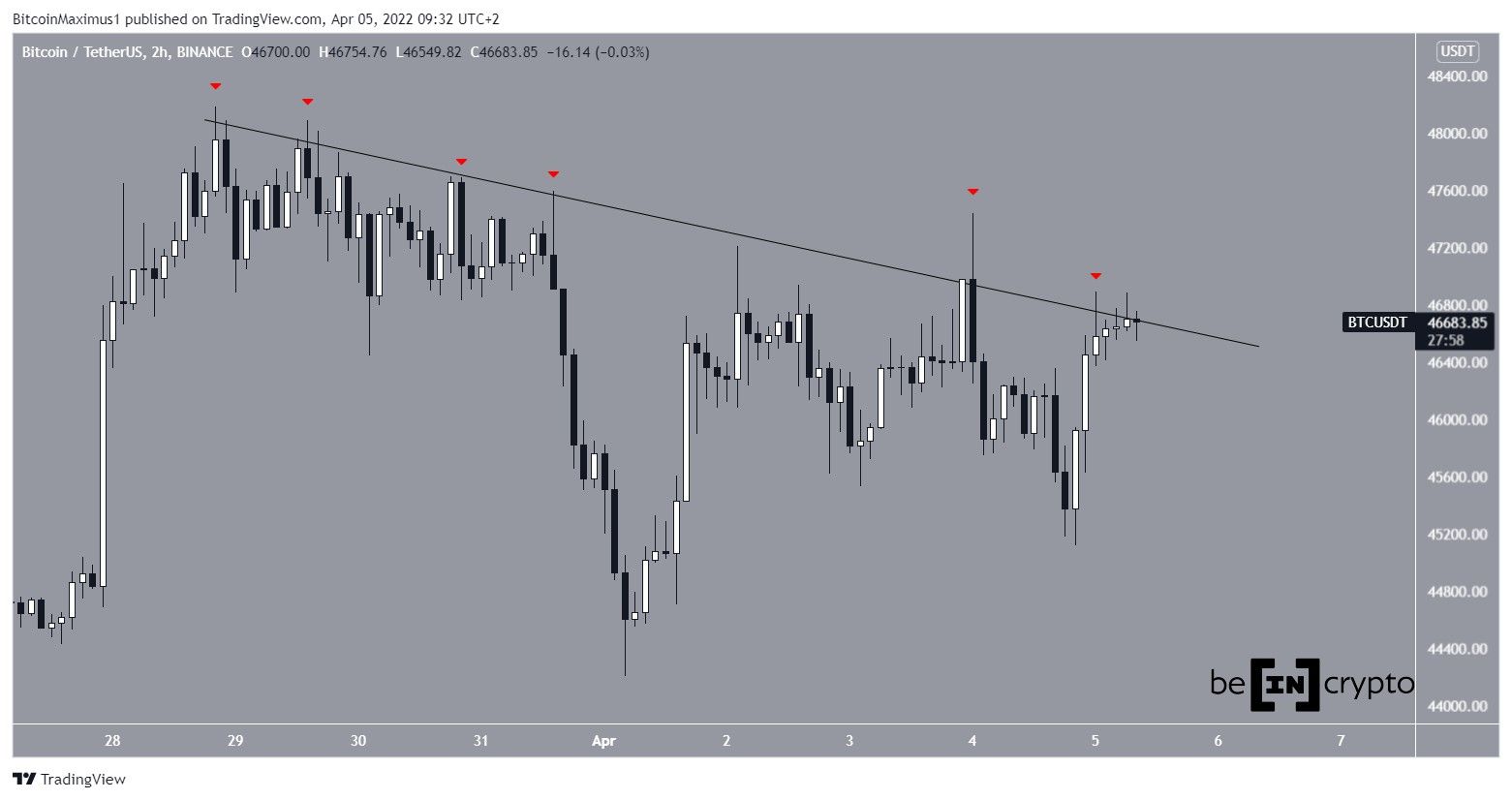 Bitcoin (BTC) has been following a descending resistance line since March 28. So far, it has made six breakout attempts (red icons) and is currently in the process of making the seventh one.
