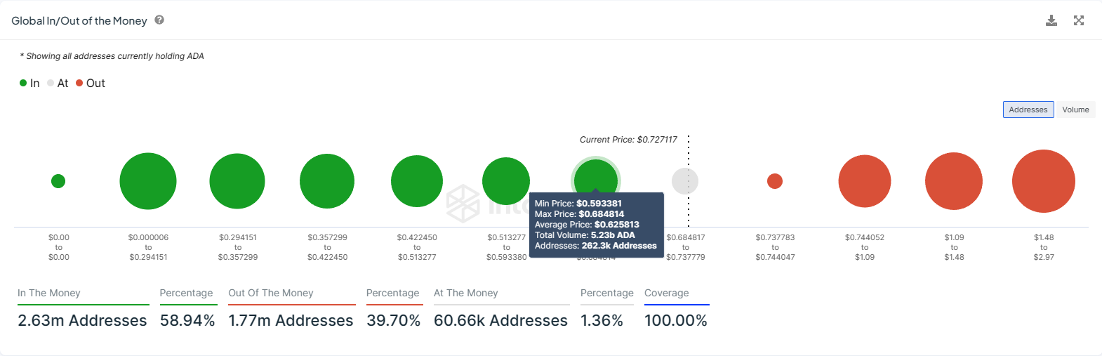 A selling spree will create a chain reaction, sending ADA to $0.68. This price is the upper limit of the cluster of 5.23 billion ADA worth $3.8 billion, bought between $0.59 and $0.68.