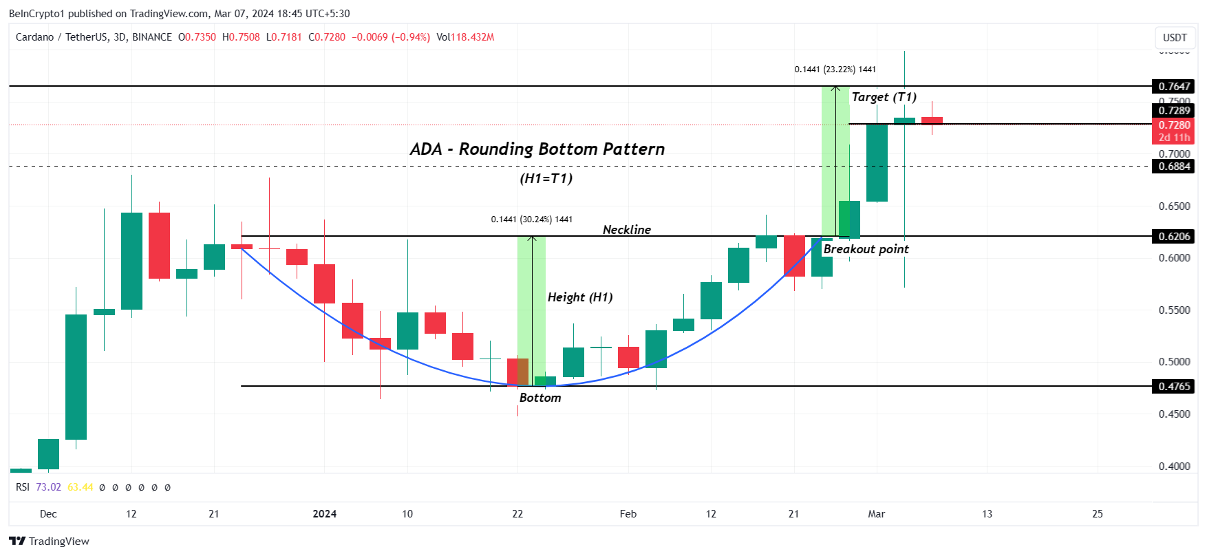 In the case of ADA, the breakout point is marked at $0.62, which forms the neckline. Per the height of the pattern, the target is $0.76. Cardano would meet this pattern if it manages to rally by another 6%.