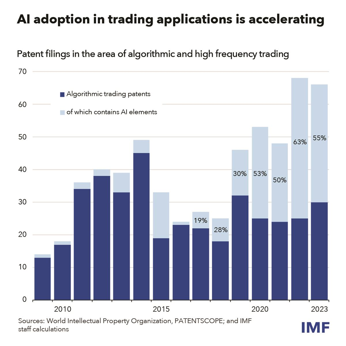 To understand the growing focus on AI technologies in trading, US patent filings provide a clear picture. Since the introduction of large language models (LLMs) in 2017, the share of AI-related content in patent applications for algorithmic trading has jumped from 19% in 2017 to over 50% annually since 2020, reflecting a sharp increase in innovation in this area.