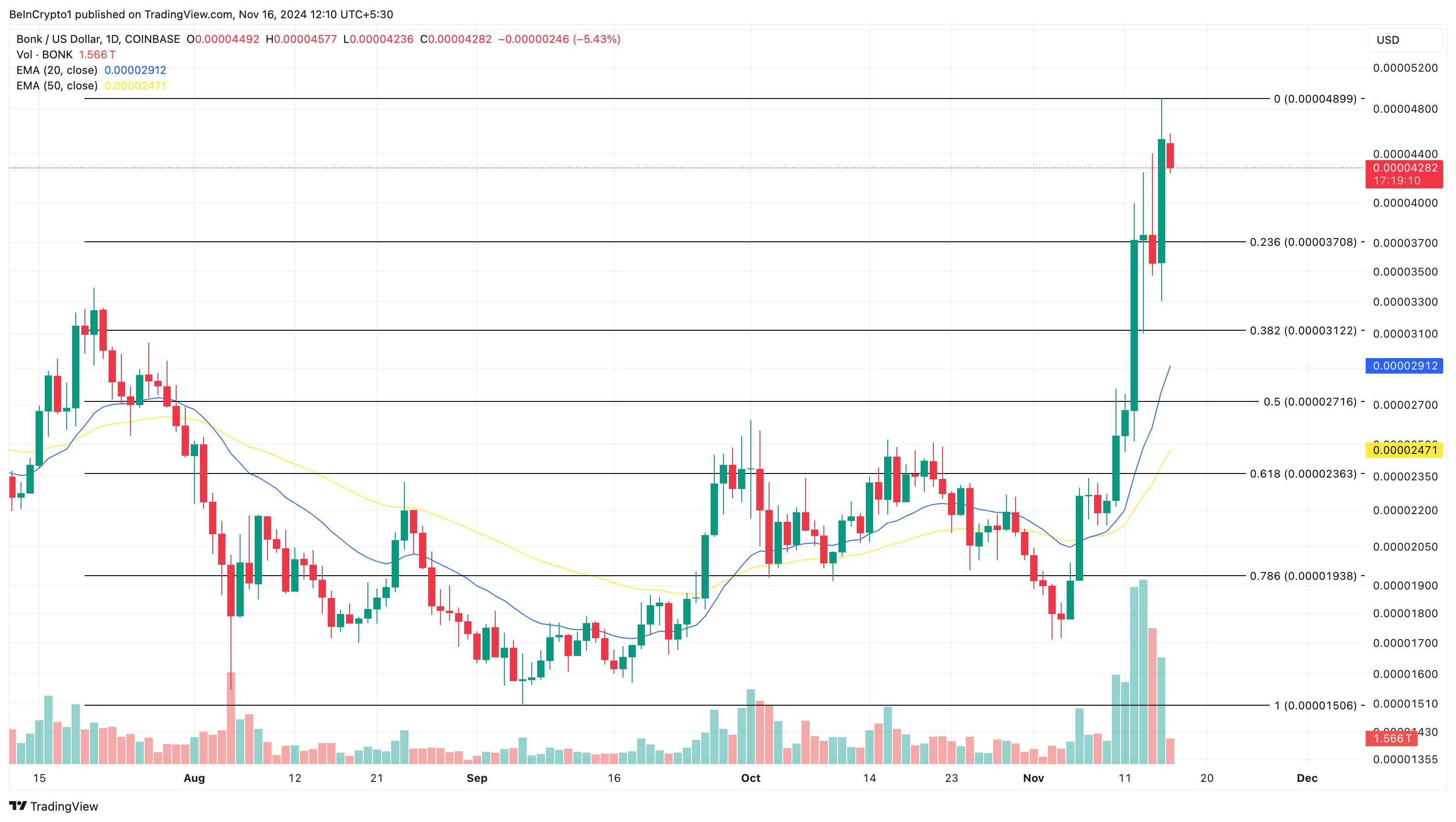 Currently trading at $0.000043, the daily chart shows that the token is well above the 20 and 50 Exponential Moving Averages (EMAs). The EMA measures trend direction over a period of time. When the price is below it, the trend is bearish.