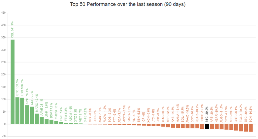 In addition, the site posts an overview of the TOP 50 cryptocurrencies for the last 90 days and compares them with the change in Bitcoin’s price. It turns out that BTC lost -20.2% in the ongoing season, while most altcoins recorded increases or lost less.