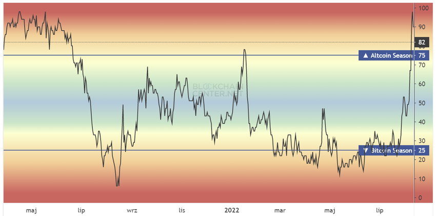 On August 10, the altcoin season index they created recorded a near-maximum value of 98. These levels have not been seen since the April-June 2021 period. Thus, if the index remains above the value of 75 for the next few weeks, we may experience a strong altcoin season 2022 in the near future.