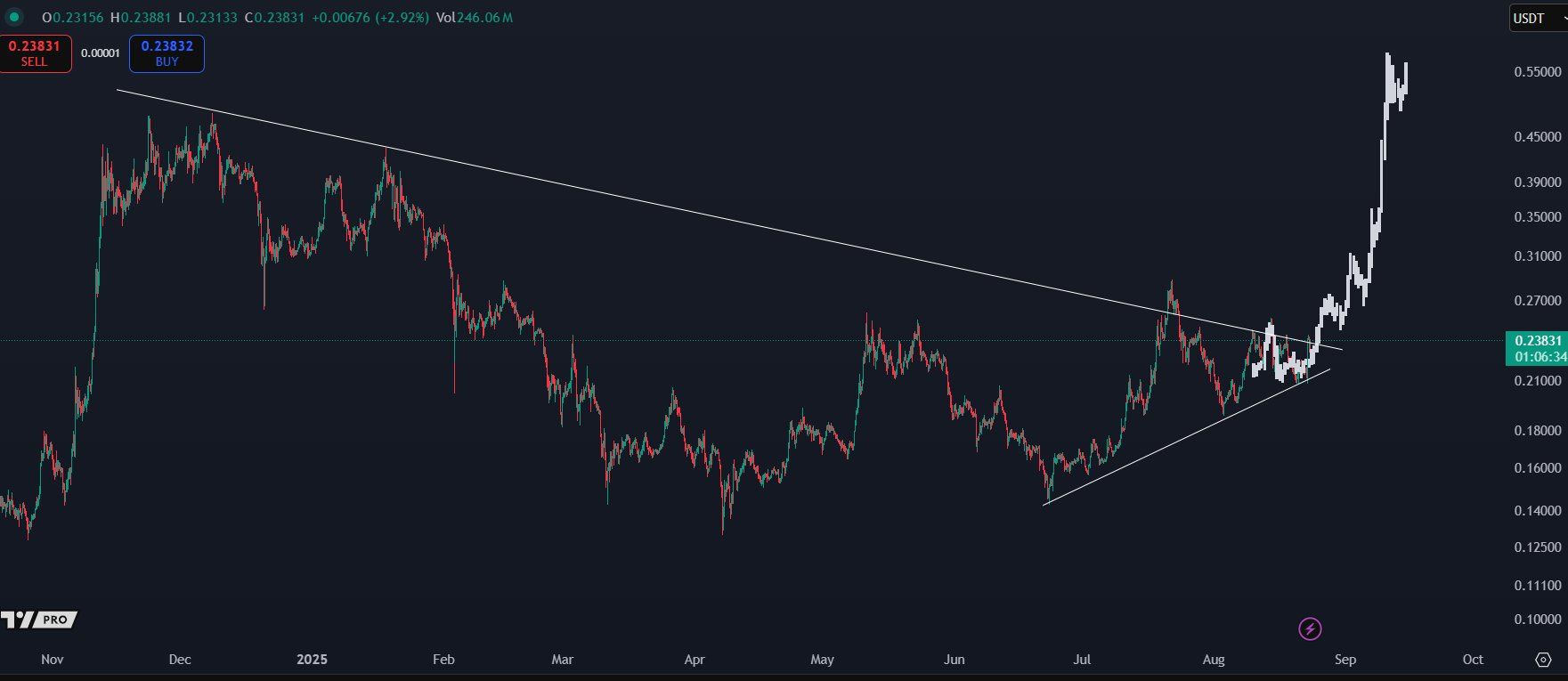 Recent analyses of DOGE suggest the meme coin is forming a large symmetrical triangle pattern. The final week of August marks a critical point as the price nears the triangle’s apex, where a breakout will confirm the next trend.