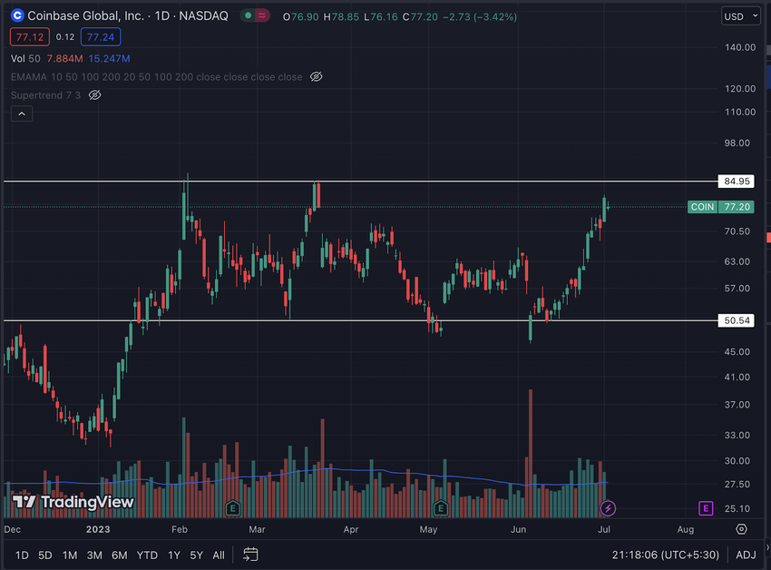 COIN is approaching major resistance at around $85. The chart below shows that the price-action of COIN has mostly been sideways from $85 to $50 in 2023.