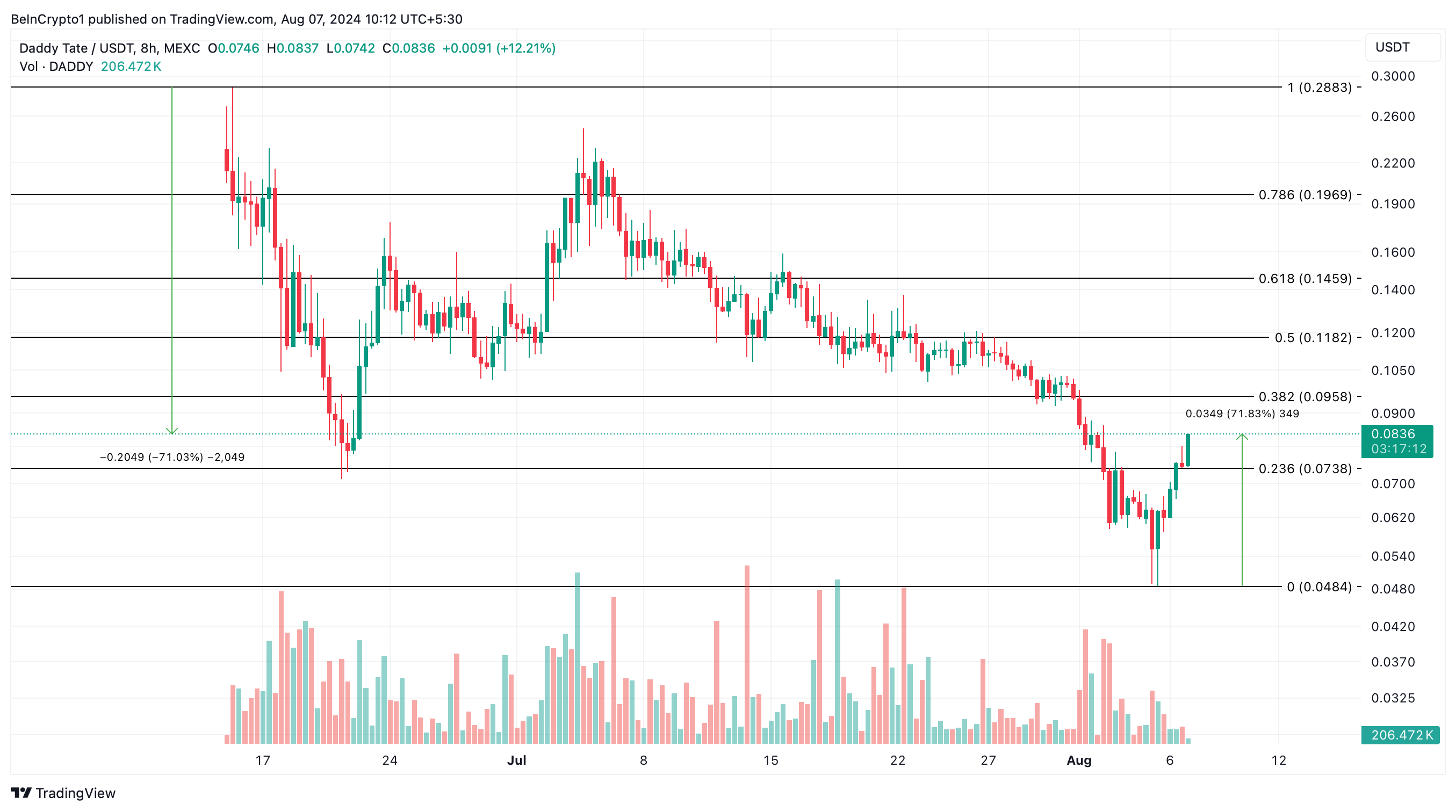 Currently, DADDY is striving to maintain its value above the Fibonacci retracement level of 0.236, which is about $0.073. This critical level is calculated from a high of $0.288 down to the recent low.