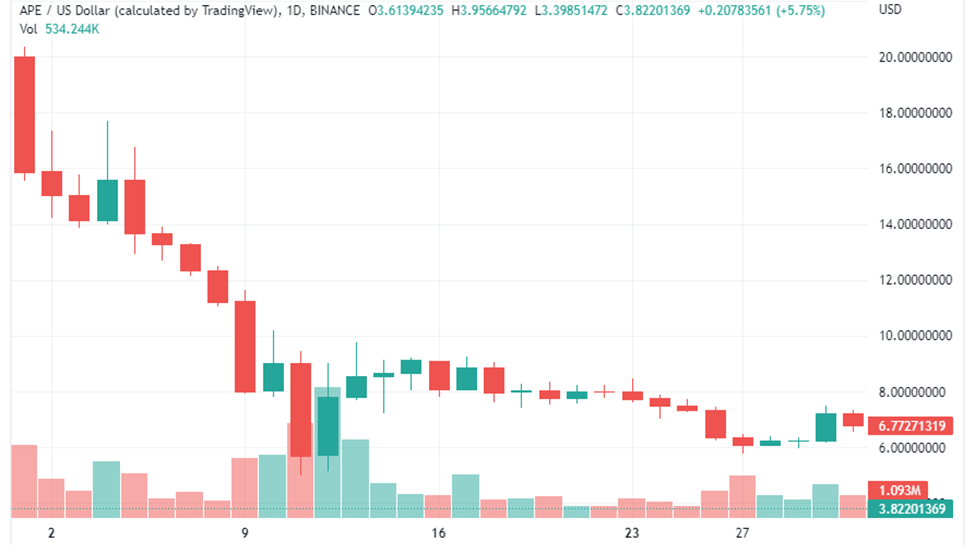 APE opened on May 1, at $20.02, reached a monthly high of $20.04 on the same day, tested a monthly low of $5.25 on May 11, and closed the month at a trading price of $6.76.