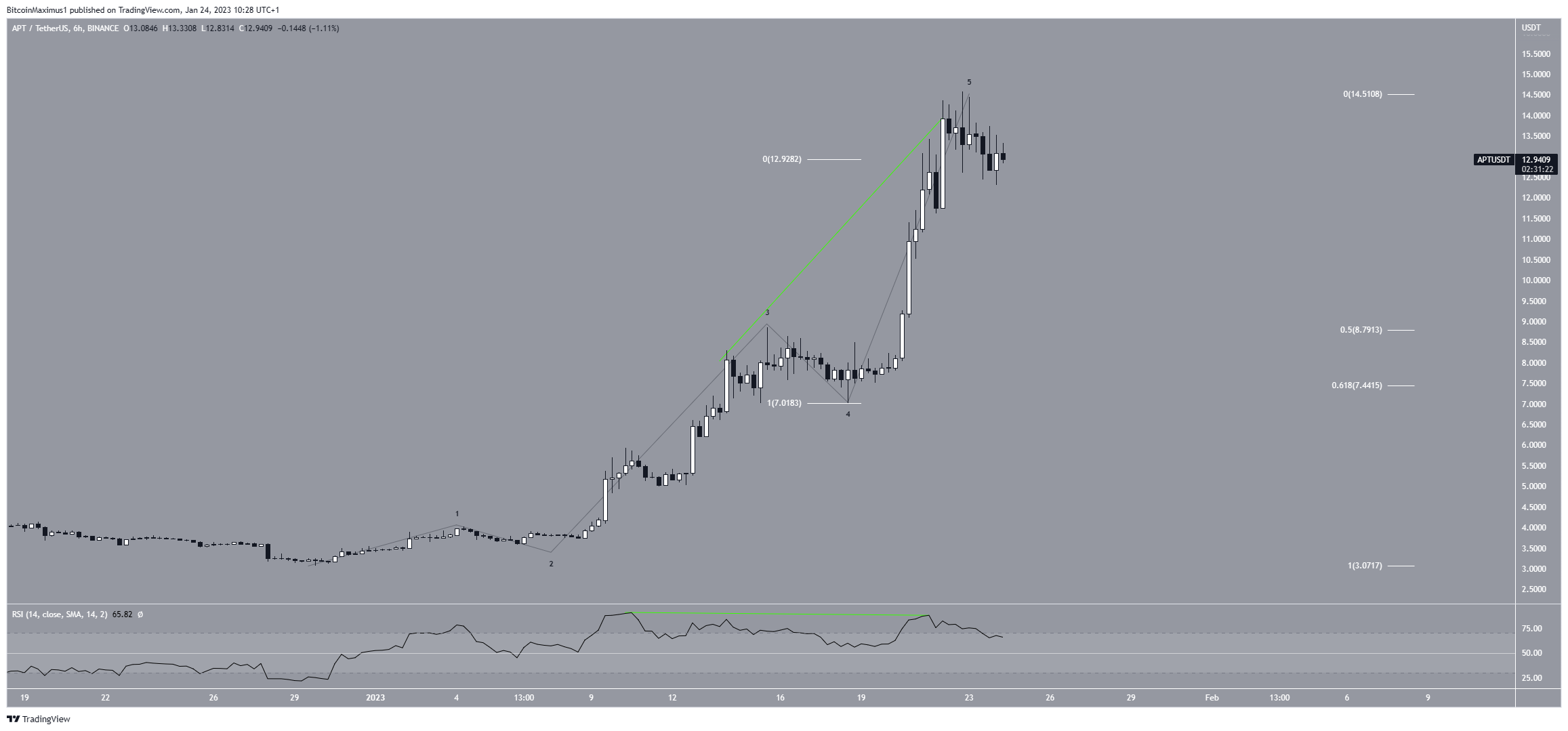 Also, wave five has the same length as waves one and three combined, which is common when wave five extends. This is another sign of a potential Aptos crypto top. The correction outline is also supported by the six-hour RSI, which has generated bearish divergence (green line).