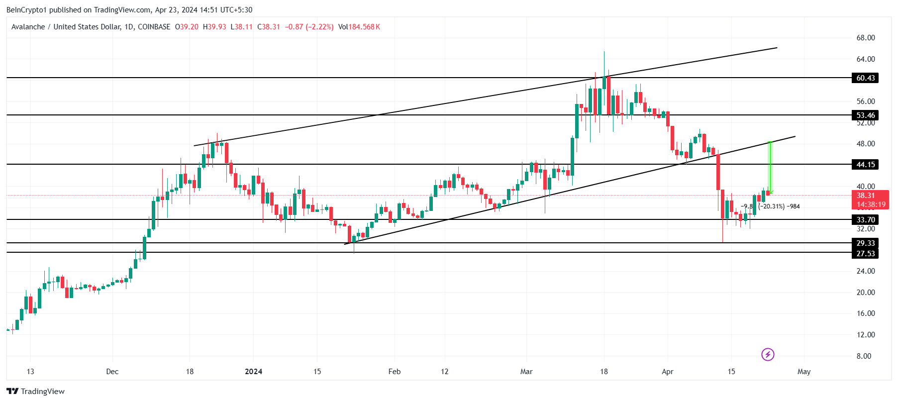 Avalanche’s price trading at $38 is close to crossing the $40 mark, and based on the observed bullishness, it could rise further. AVAX is facing a barrier at $44, and breaching it could enable a rise to $48 – $50, which marks the lower trend line of the rising channel the altcoin was in.