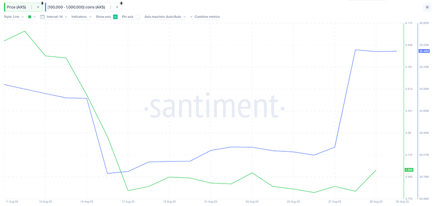 With AXS currently trading around $4.91, the newly-acquired 1.63 million tokens are worth nearly $8 million. Notably, the recent trading patterns of this whale cohort have been closely correlated to price action.