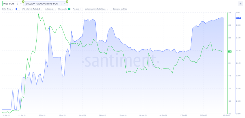 SponsoredIndicatively, the cumulative balances of whales holding 100,000 to 1 million BCH stood at an aggregate of 2.41 million as of September 21. But remarkably, it has since gradually increased to 2.57 million at press time on October 9.