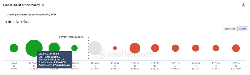 The Global In/Out of Money Around Price (GIOM) data, which depicts the entry price distribution of current BCH holders, also buttresses this prediction.