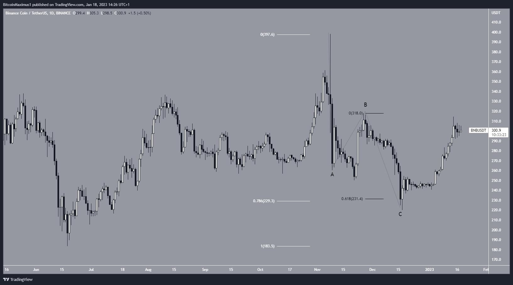 If that is correct, there are two possibilities for the future Binance Coin price movement. Both of them indicate that the upward trend is likely to continue in the short-term, despite the slight drop over the past 24 hours.
