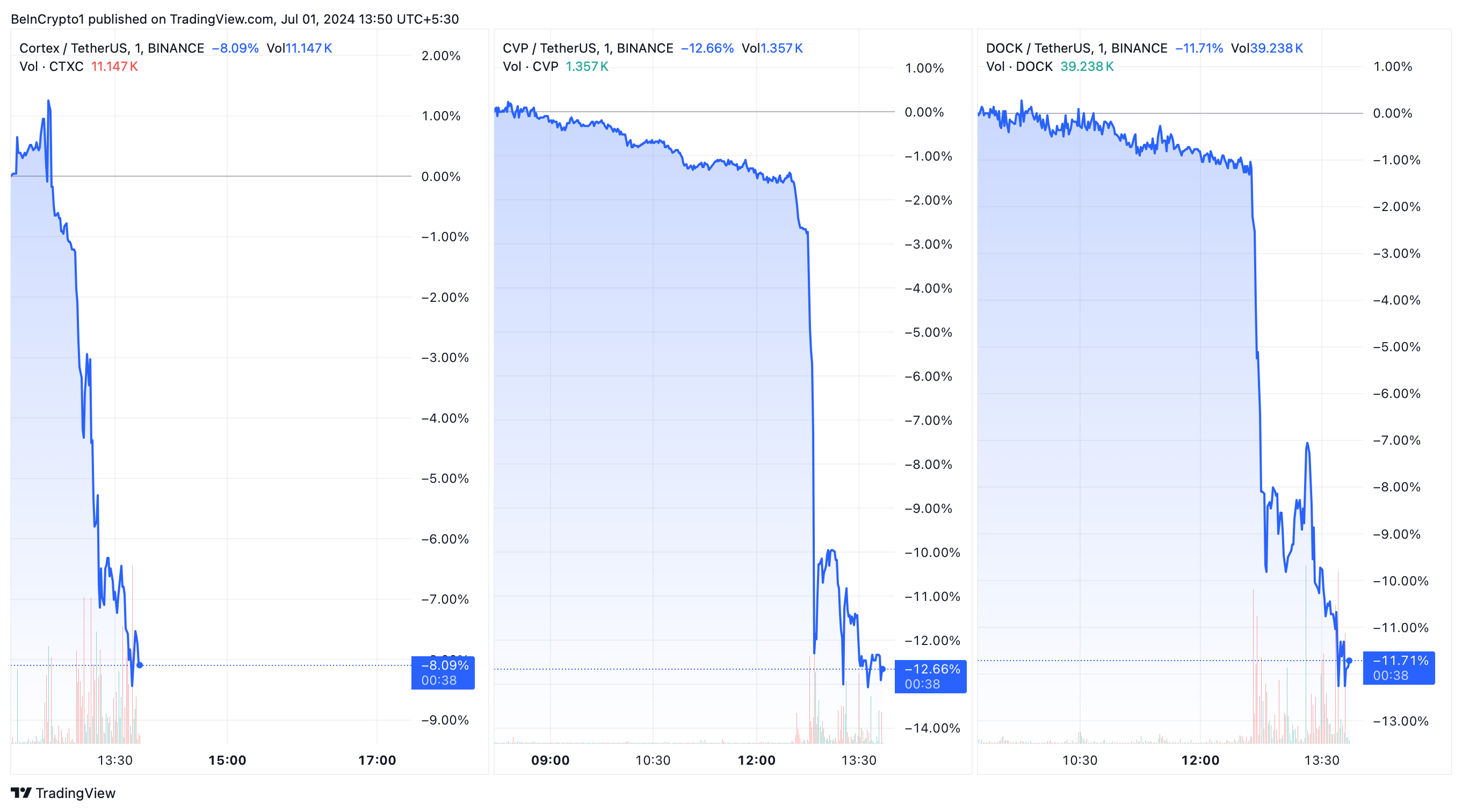 SponsoredFollowing this announcement, notable market reactions were immediate. CTXC saw a sharp decline of 8.09%, CVP dropped by 12.66%, and DOCK also decreased by 11.71%. On the other hand, the other tagged altcoins experienced more modest drops.