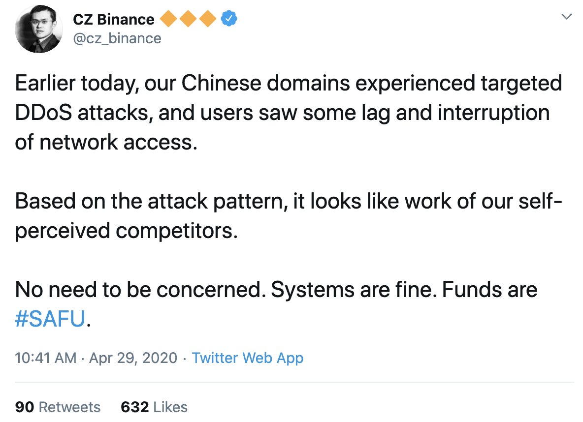 Binance’s CEO, Changpeng Zhao, has said that the exchange’s Chinese domains suffered DDoS attacks which were allegedly carried out by competitors.