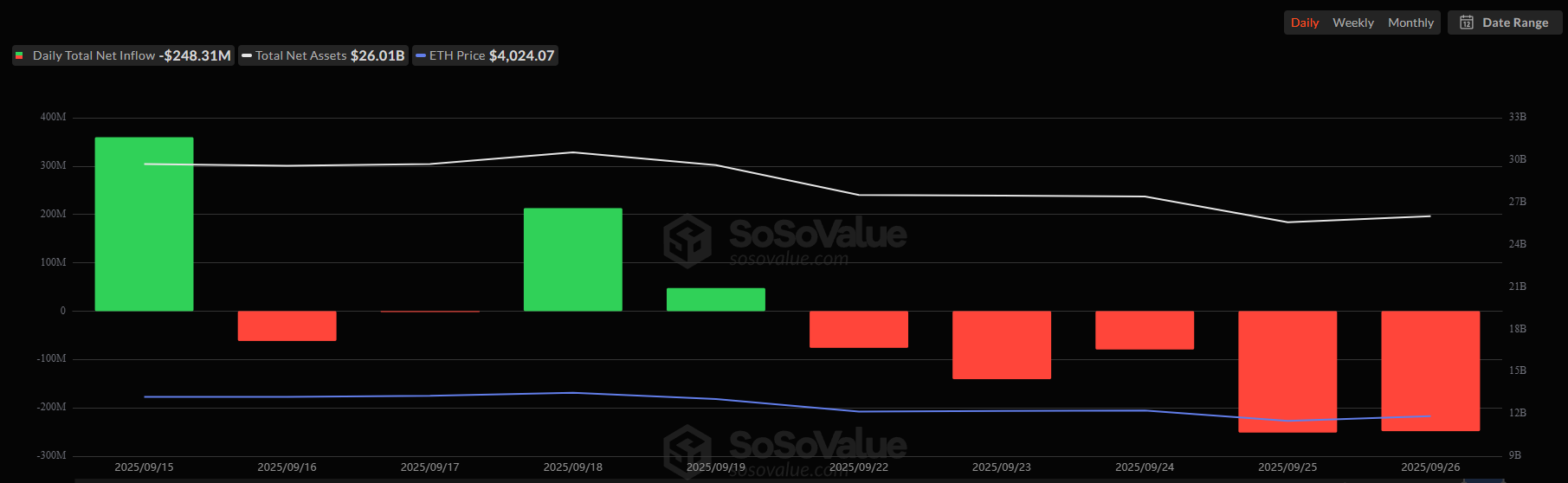 Ethereum products mirrored the downturn but endured even heavier losses.