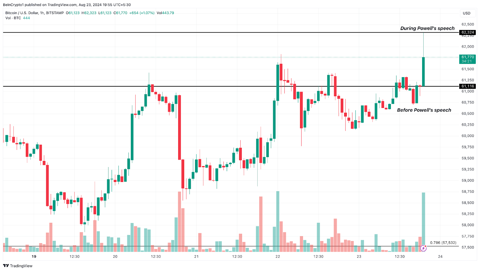 Bitcoin’s (BTC) price rose above $62,000 after Fed Chair Jerome Powell hinted at interest rate cuts on Friday. The chair mentioned this in his Jackson Hole Speech, leading the coin to jump in less than an hour.