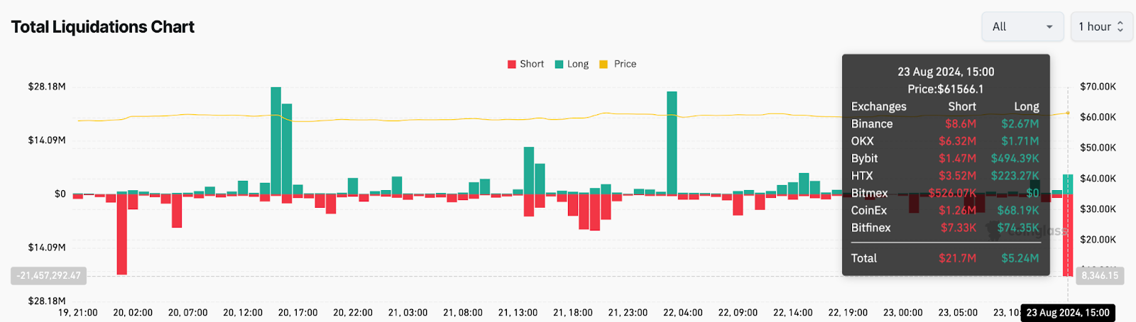 When this happens, exchanges are forced to close the position to prevent further losses. As seen below, over $21 million of shorts were liquidated, while long liquidations amounted to a little over $5 million.