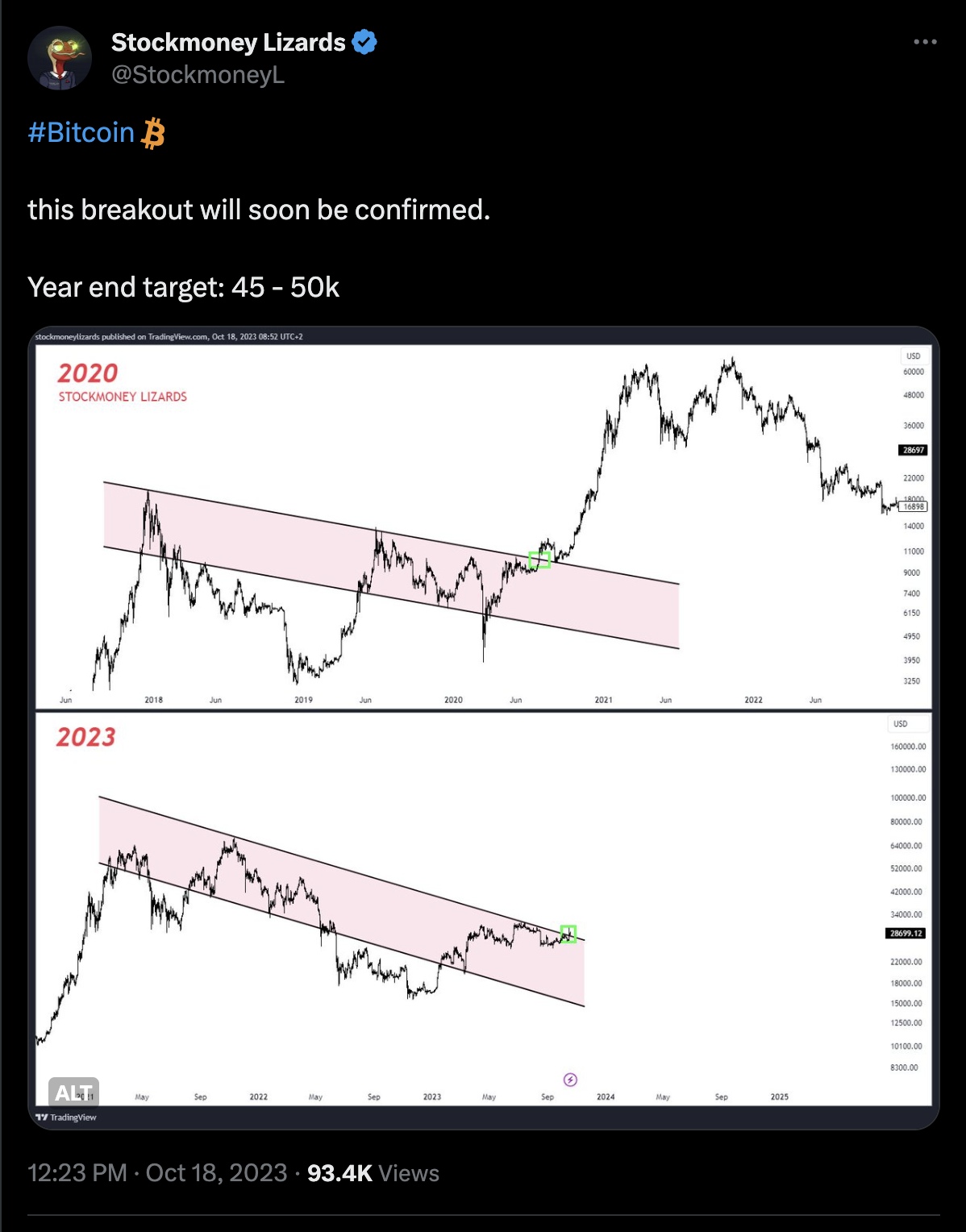 The current Bitcoin market trend bears remarkable similarities to the price movement from 2017-2020. According to the analyst Stockmoney Lizards, this could lead to a key breakout moment, similar to the green area on the chart, and a decisive bull market.