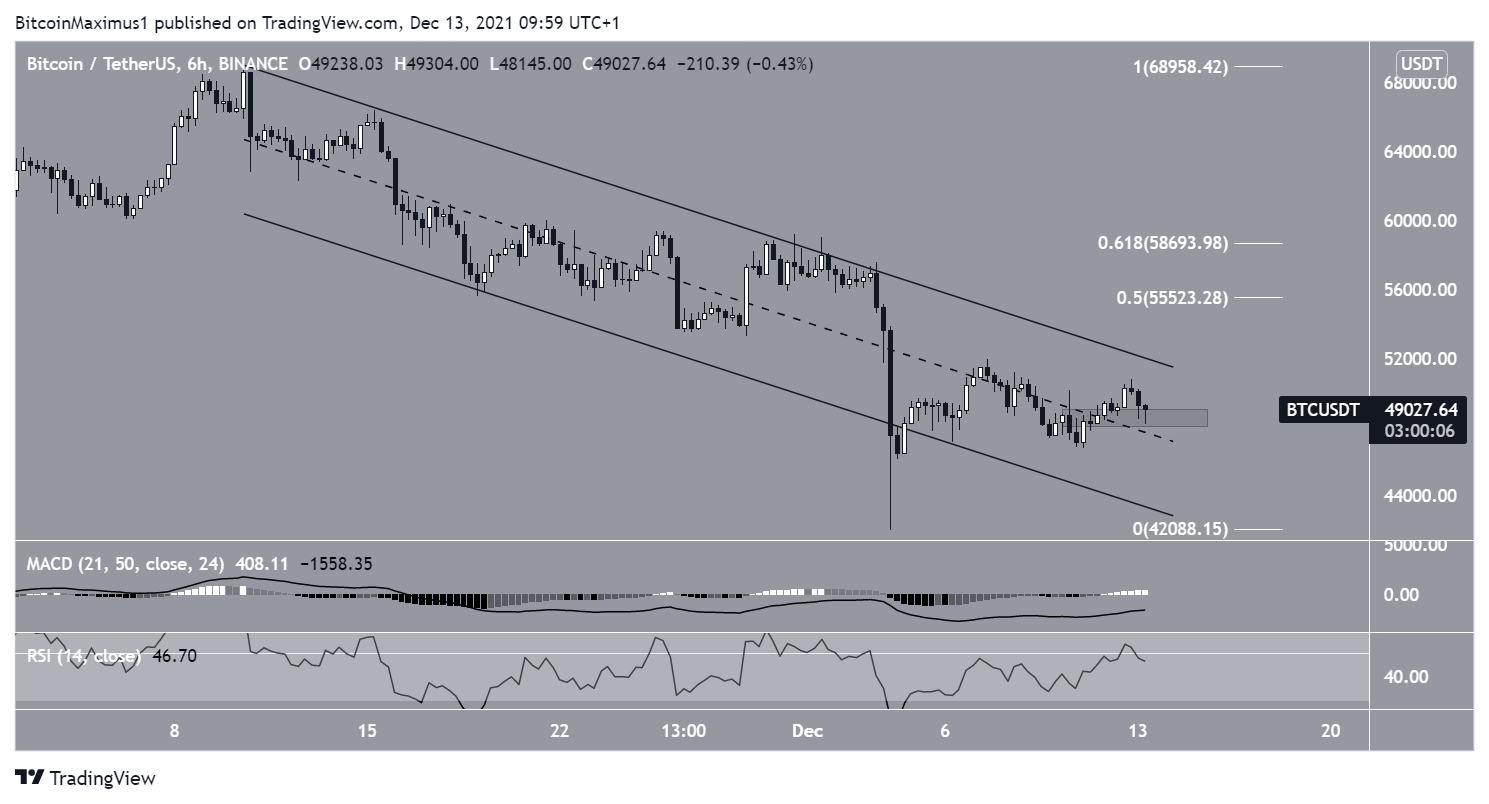 The six-hour chart shows that BTC has been trading inside a descending parallel channel since the Nov 10 all-time high price of $69,000.