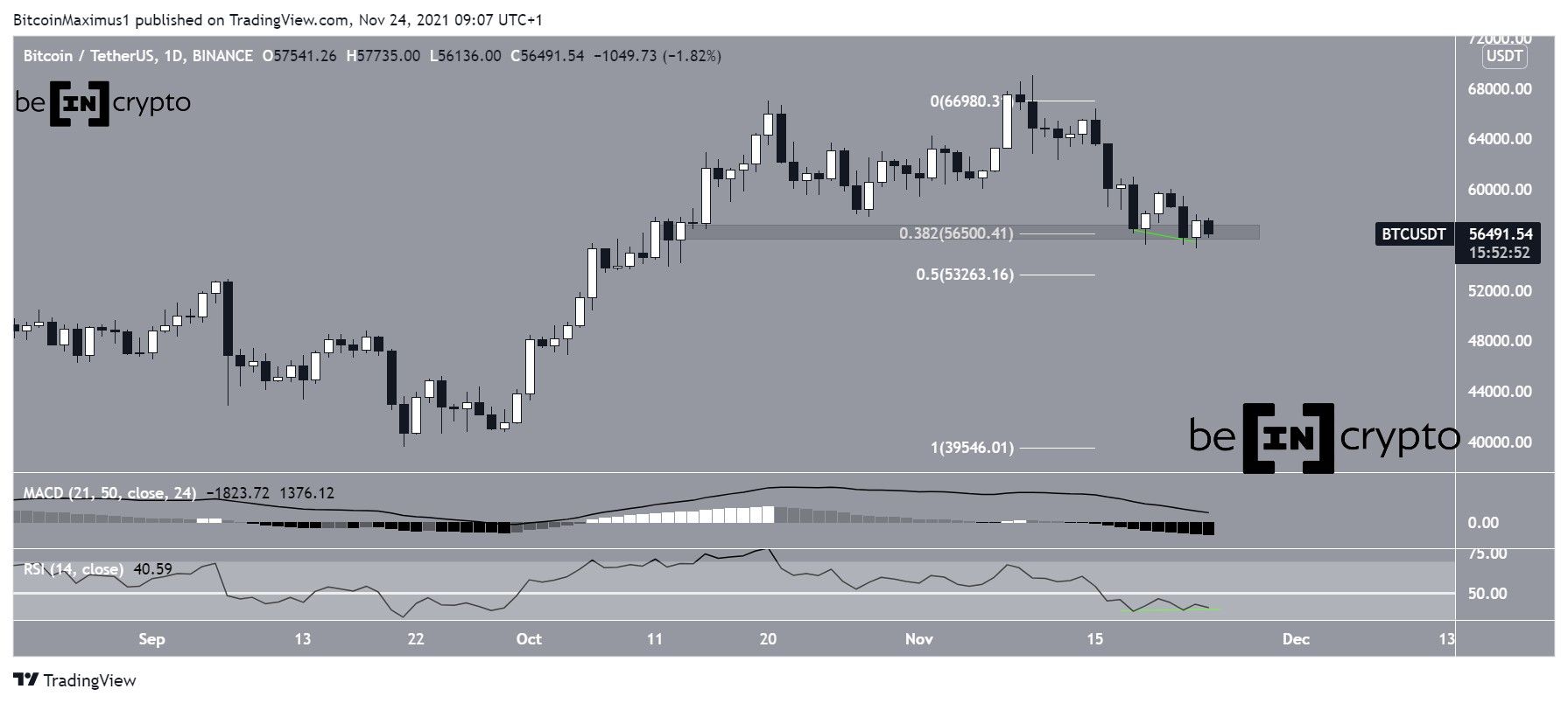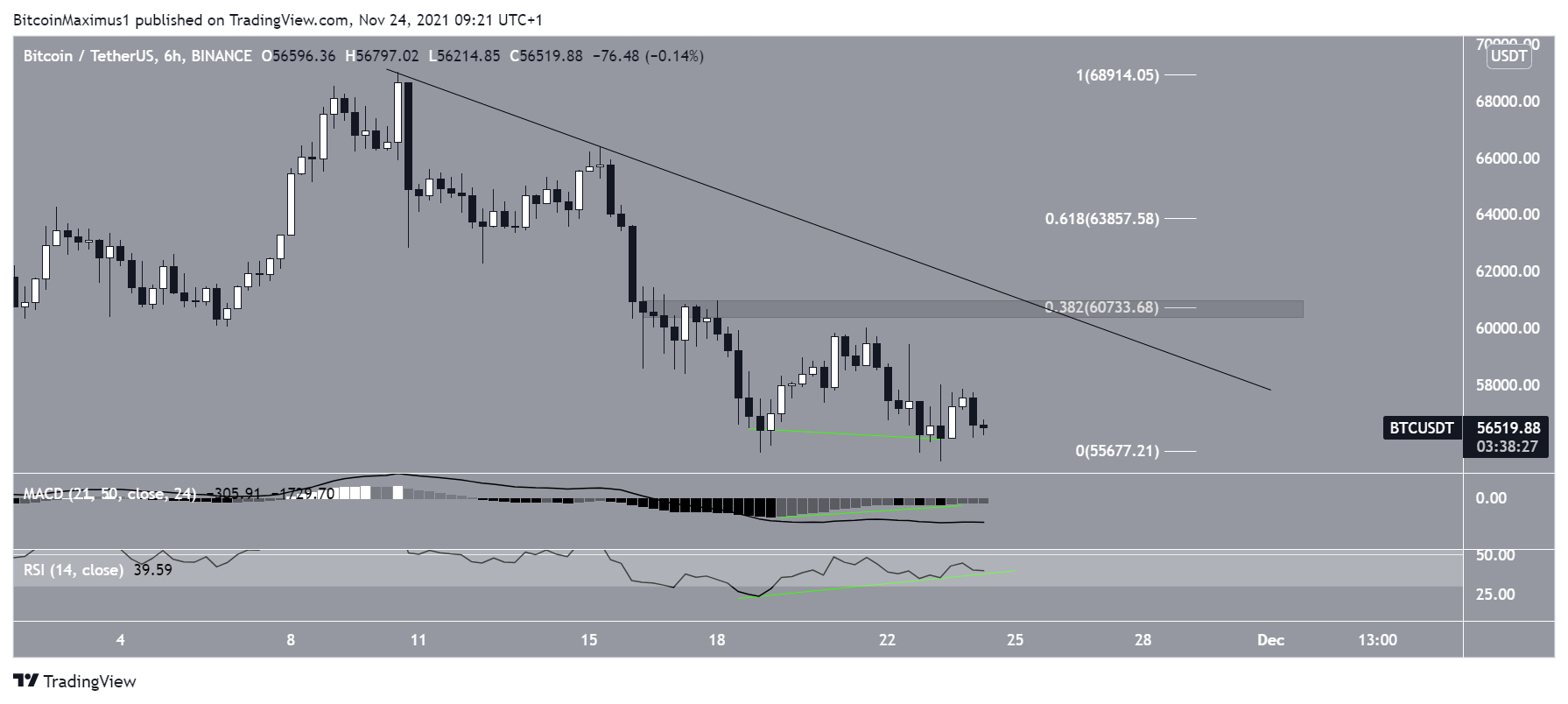 BTC has been falling since reaching an all-time high price of $69,000 on Nov 10. So far, the decrease has led to a low of $55,317, which was reached on Nov 23.