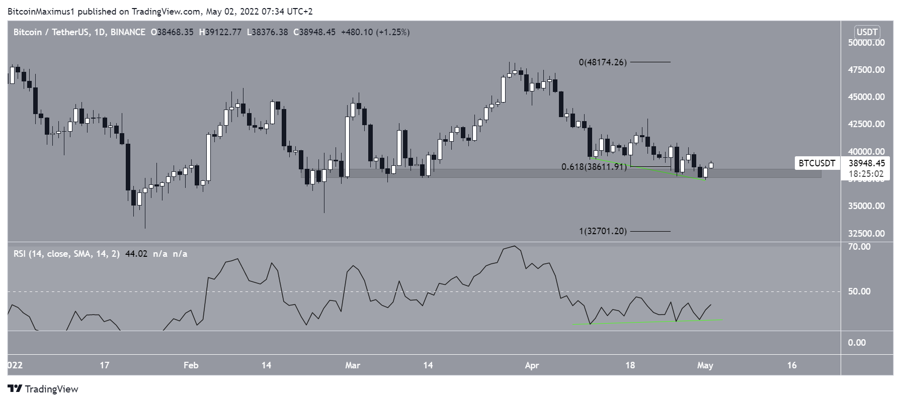 The daily chart shows that BTC has been falling since March 28. The decrease led to a low of $38,376 on May 1.