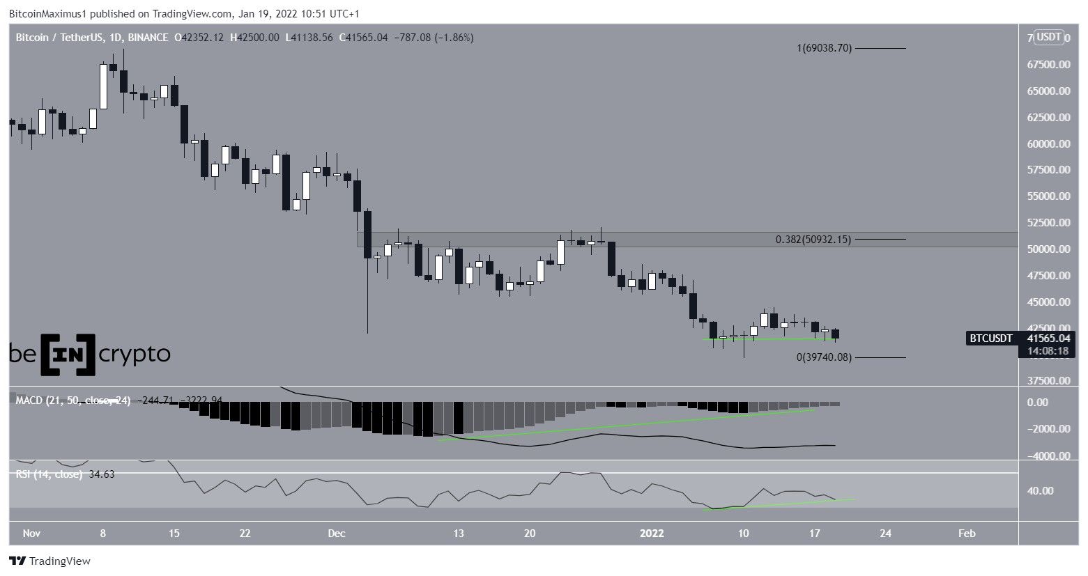 After a brief rebound, BTC created a slightly lower low on Jan 19. This served to validate the $41,200 area as minor support.Â