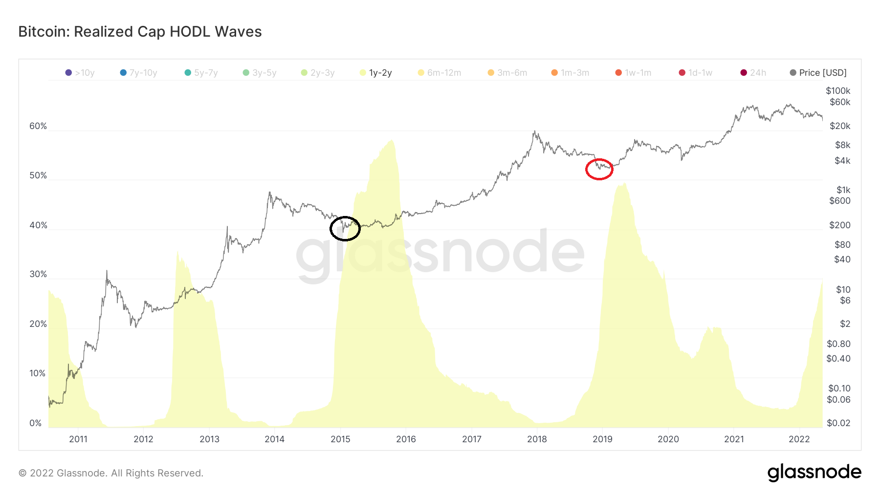 During the Jan 2015 bottom (black circle), the one to two-year band comprised of 33% of the entire number of BTC transactions. Afterward, it increased all the way to 55% during the accumulation phase.