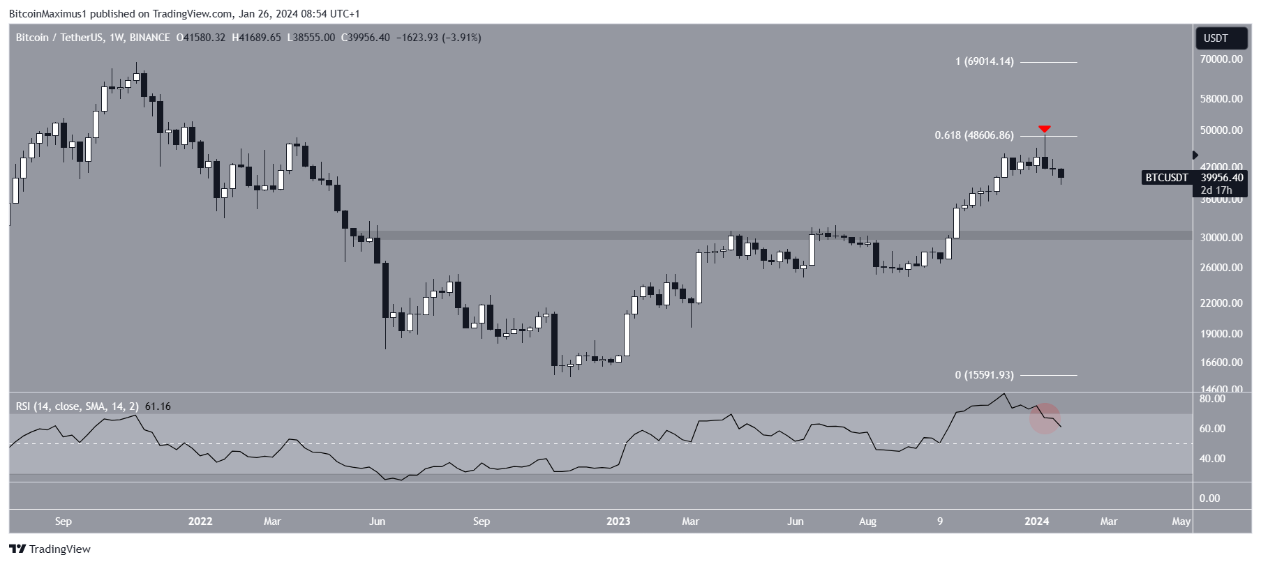 The technical analysis of the weekly time frame shows that the BTC price has increased since the start of 2023. The upward movement culminated with a high of $48,969 the week of the ETF approval.