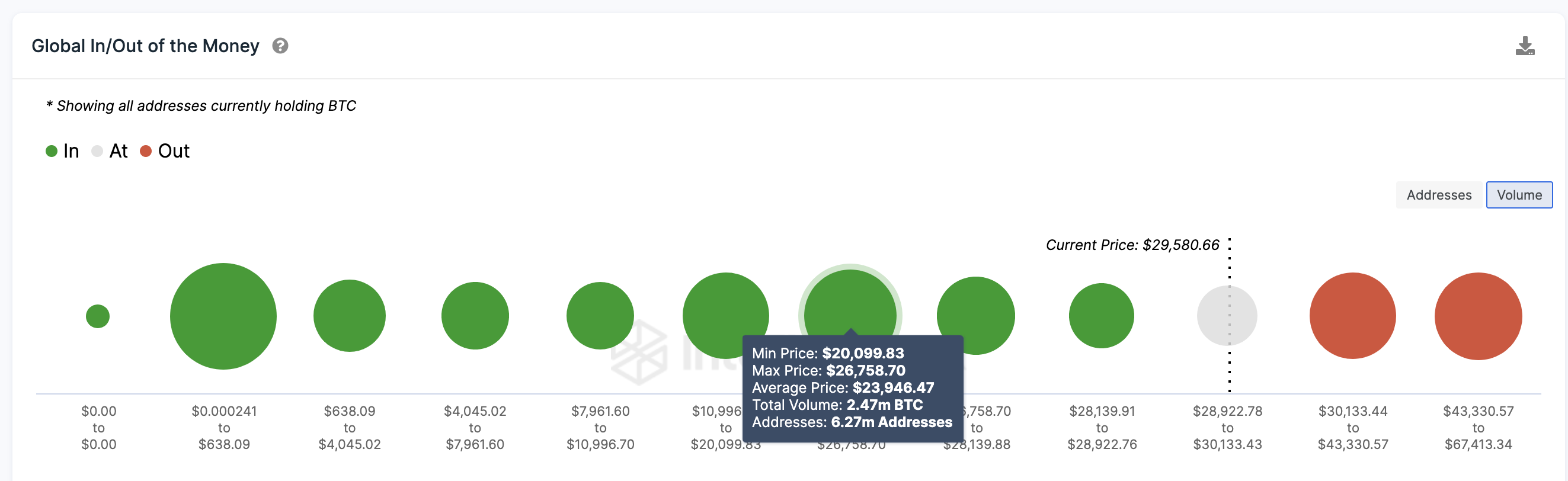 It shows that BTC’s initial resistance around the $30,130 territory is quite significant. As illustrated below, the 2.08 million addresses bought 842,330 BTC at an average price of $30,133.
