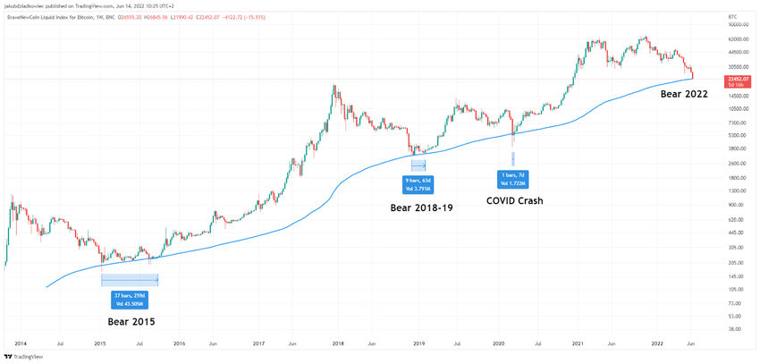 In the chart above, we notice the blue line where Bitcoin’s decline seems to be currently stopping. This is the 200-week moving average (200W MA) – a level of very high historical significance.