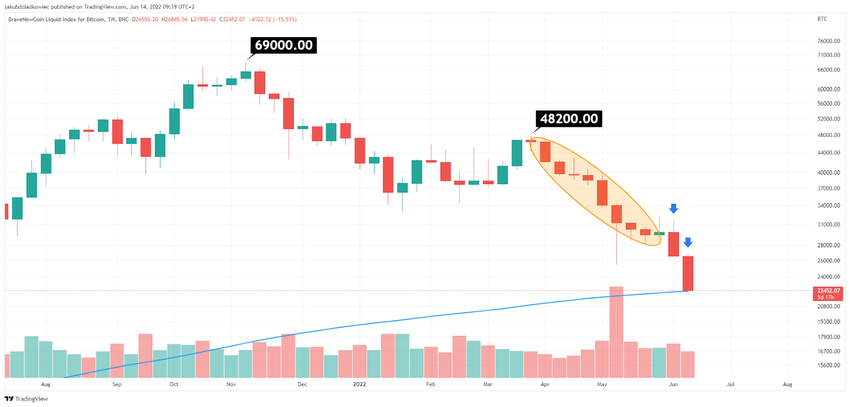 Yesterday’s daily candle alone had a body of -15.38% and brought the price down to the $21,925 level at the bottom of the wick. This morning, Bitcoin continued its declines, taking it to a low of $20,846.