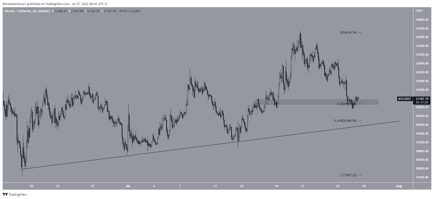 The six-hour chart shows that BTC had been increasing above an ascending support line since June 19. Currently, the support line is located at $20,200, aligning with the 0.618 Fib retracement support level.Â