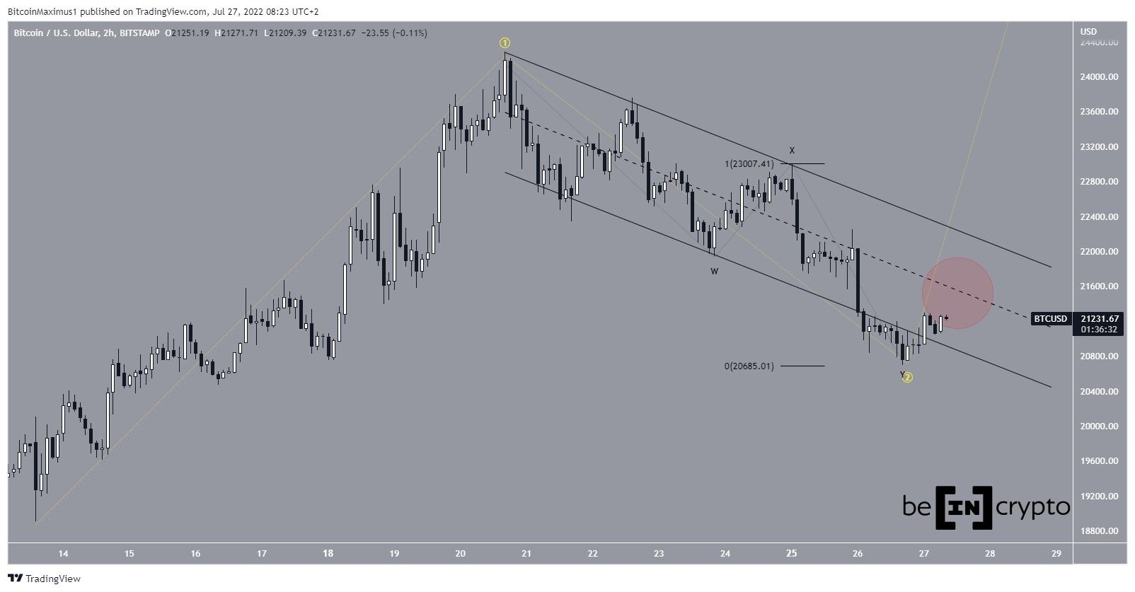The most likely short-term wave count suggests that Bitcoin is in wave two (yellow) of a five-wave upward trend. Inside it, the sub-wave count (black) shows a complex W-X-Y corrective pattern, in which waves W and Y had an exact 1:1 ratio.Â