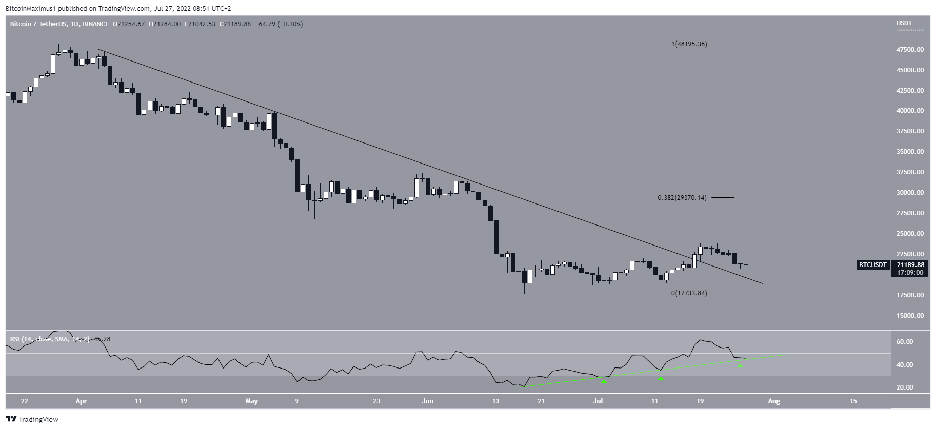 Bitcoin had been trading below a descending resistance line since April 5. The line caused several rejections, most recently on June 7. Following this, Bitcoin decreased to a long-term low of $17,622 on June 18.Â