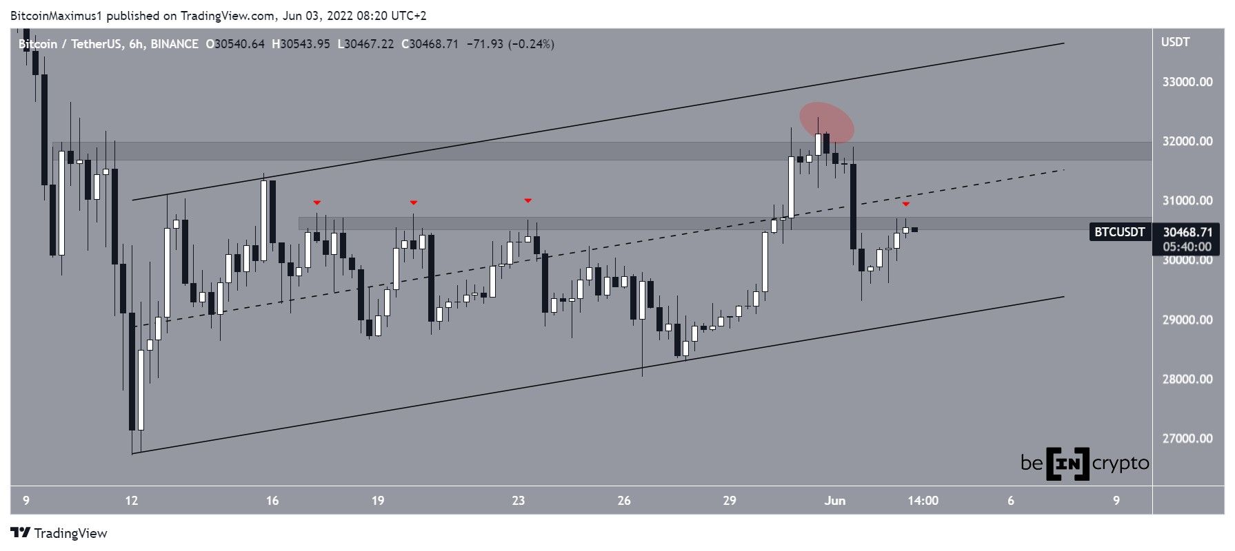 BTC has been increasing inside an ascending parallel channel since May 12. The upward movement led to a high of $32,399 on May 31. Initially, it seemed that this had caused a breakout from the $31,800 horizontal resistance area. However, the price decreased immediately afterwards, rendering the breakout as only a deviation (red circle).Â