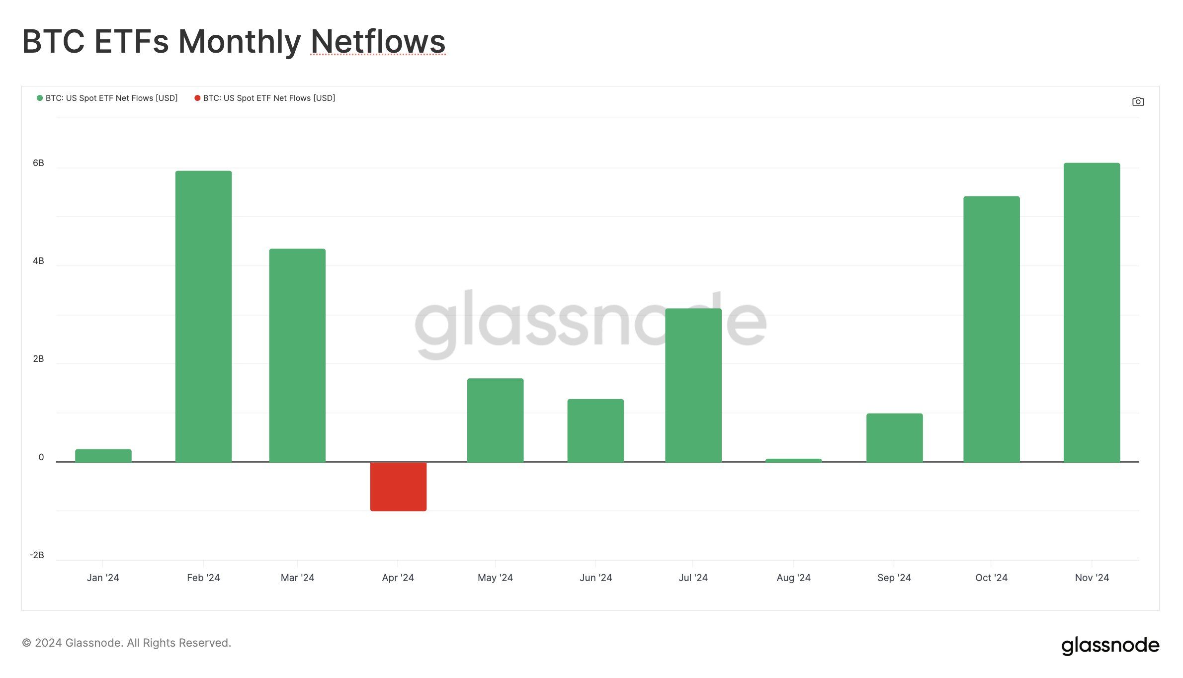 In November, Bitcoin ETFs recorded $6.1 billion in inflows, the highest monthly influx since the launch of spot Bitcoin ETFs in January. This surge indicates that investors are becoming more comfortable with the asset, preferring the security of regulated ETFs over direct Bitcoin purchases. With growing institutional interest, it’s likely that this trend will continue into December, potentially propelling Bitcoin to new heights.