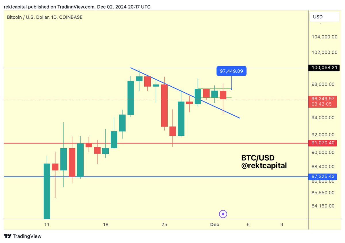 Analyst Rekt Capital placed the target for Bitcoin at $100,068 as the crypto king continues to show signs of impending rise. The analyst noted that BTC just completed a retest of the lower high and will likely aim for consolidation.