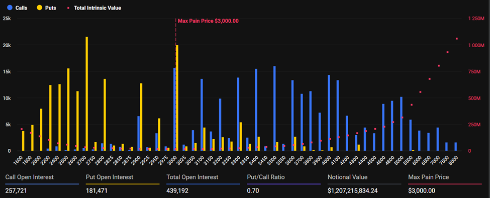 Ethereum reflects a similar, though slightly more balanced, setup. ETH is trading at $2,751, below its $3,000 max pain level. Total open interest in Ethereum options stands at 439,192 contracts, with call open interest at 257,721 and put open interest at 181,471. The resulting put-to-call ratio of 0.70 suggests more two-sided positioning compared to Bitcoin, but still points to caution rather than outright bearishness.