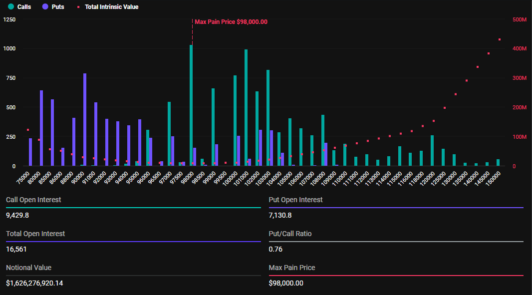 Today’s expiring Bitcoin options have a notional value of $1.62 billion. These 16,561 expiring contracts have a put-to-call ratio of 0.76 and a maximum pain point of $98,000.