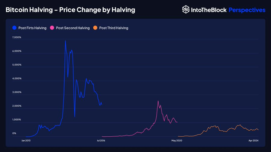 Nevertheless, historical data reveals a diminishing percentage increase following each halving. After the first halving, Bitcoin soared from $13 to $652, marking a staggering 4,802% surge. Subsequent halvings have yielded reduced percentage increases, hinting at a similar pattern this time.