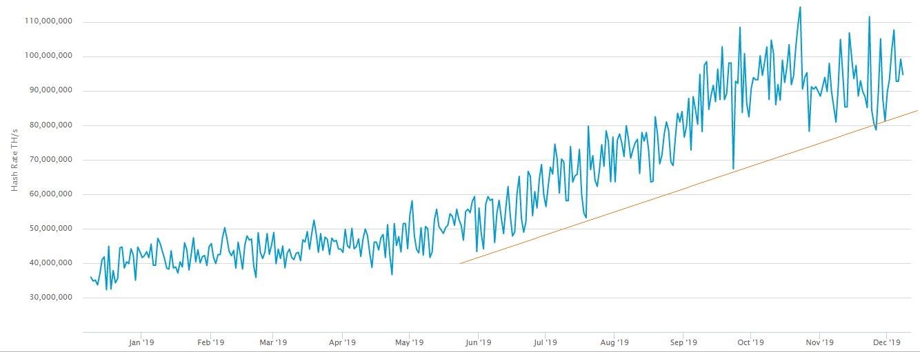 The Bitcoin network hash rate is currently hovering around the 100 million Th/s mark — occasionally going way above that milestone figure.