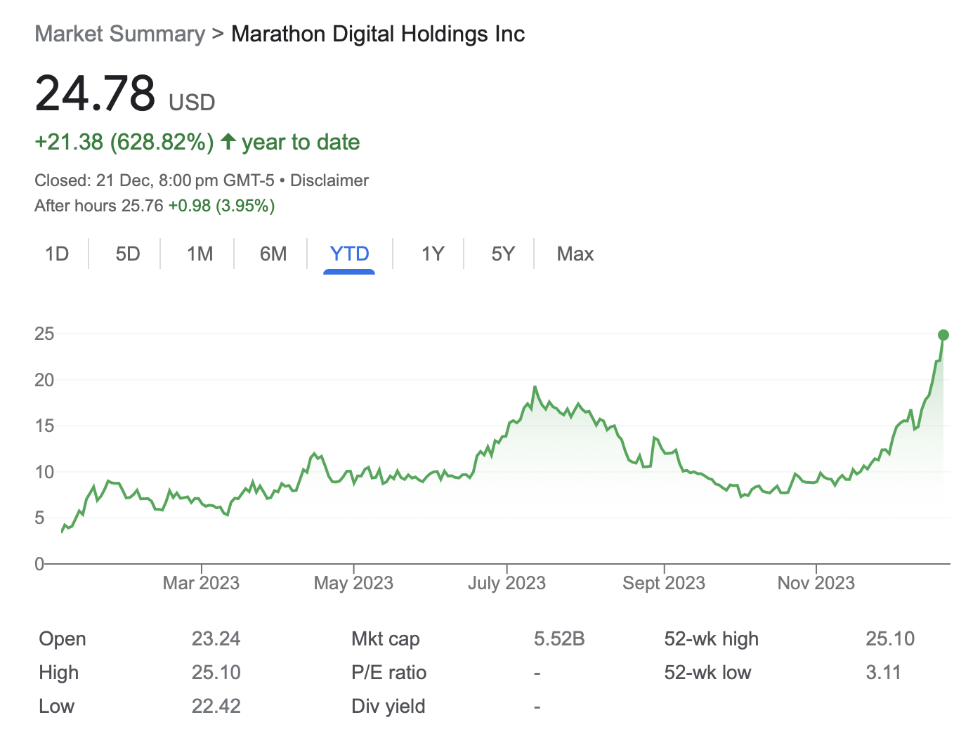 Marathon Digital’s stock has surged by 628.82% since January 1. Its current price stands at $24.78 as of the time of publication.