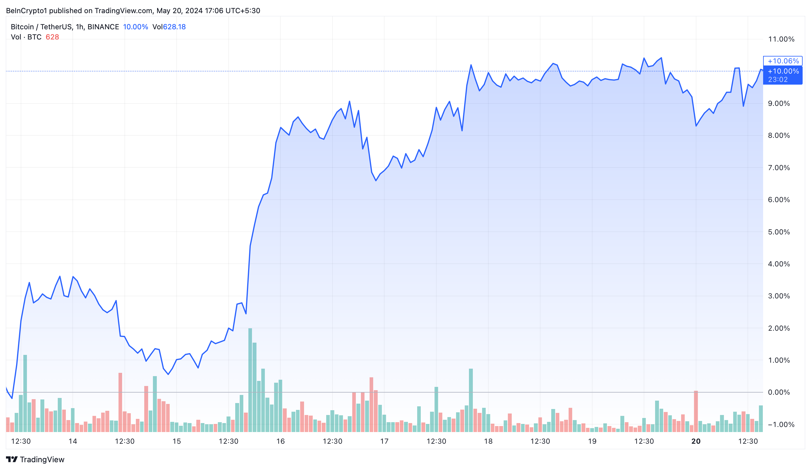 Bitcoin’s price action has shown significant improvement recently. Prices rebounded towards the late April resistance zone of $67,500, surpassing early May highs of $64,000.