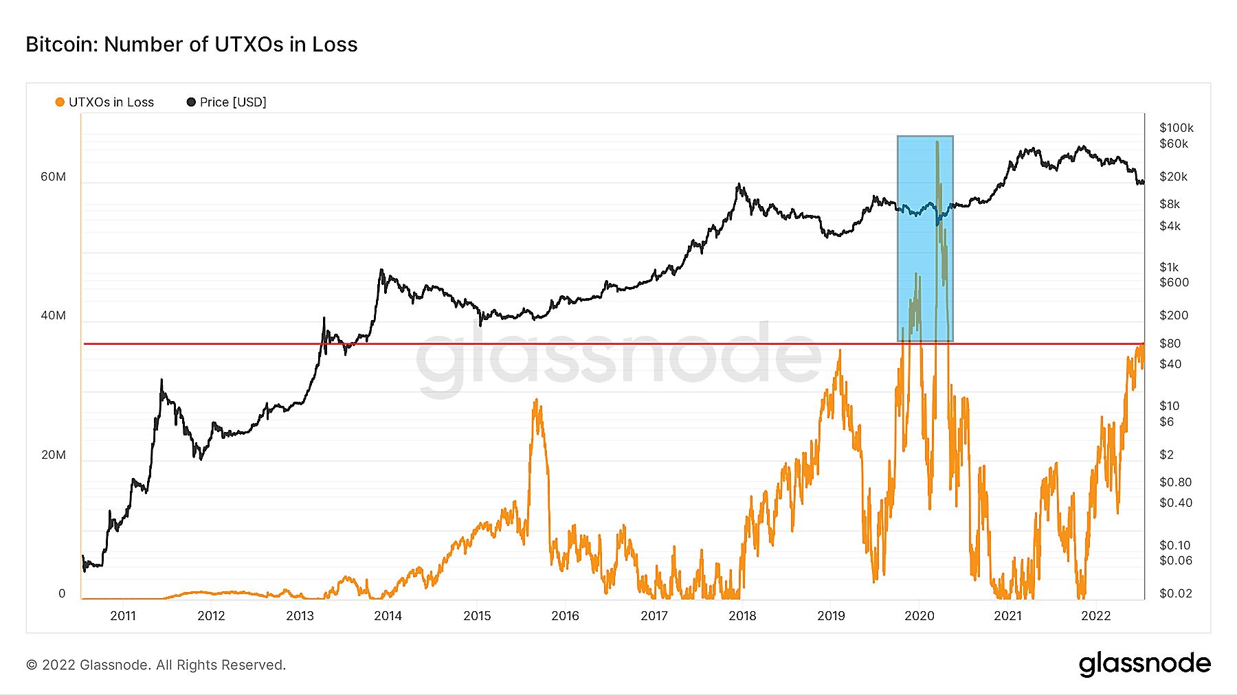 Despite this, the current UTXOs in loss are still lower than the peaks of Oct 2019 – April 2020 (blue area). This also shows that with the current size of the Bitcoin network, there is still a possibility of eventual capitulation before the downtrend is reversed.